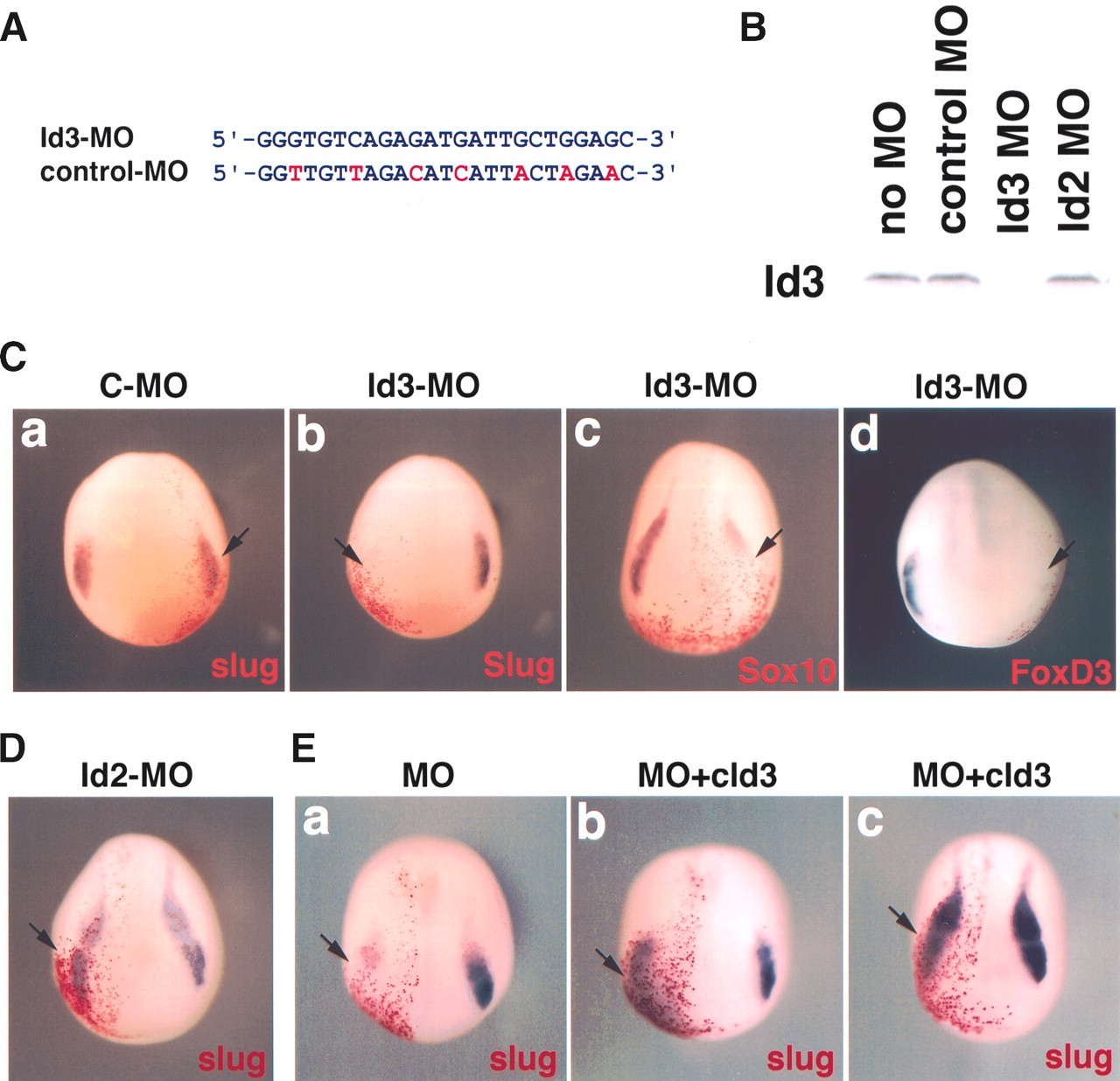 Id3 depletion leads to a loss of neural crest progenitors. (A) Morpholino antisense oligo sequence (Id3-MO) corresponding to a region 5â² upstream of the Id3 start codon (25 bp; -8 to -32) and its control oligo (control-MO) with seven mismatches (red letters). (B) Id3 protein synthesis was monitored in the absence of oligo (no MO) or in the presence of morpholino oligos (control, Id3 or Id2 oligo) in an in vitro translation system. Only Id3-MO specifically blocks Id3 protein translation. (C) Neurula-stage embryos injected with control-MO or Id3-MO. (Panel a) slug expression (arrow) is intact on the side injected with control-MO (C-MO, Red-Gal). (Panels b-d) Embryos injected with Id3-MO show the loss of early neural crest markers (arrows) on the injected side, which is marked by Red-Gal staining: slug (panel b), sox10 (panel c), and foxD3 (panel d). (D) slug expression is not affected by Id2 depletion (arrow). (E) The loss of neural crest progenitors by Id3 depletion (panel a) is rescued in the presence of chick Id3 (panels b,c). |
