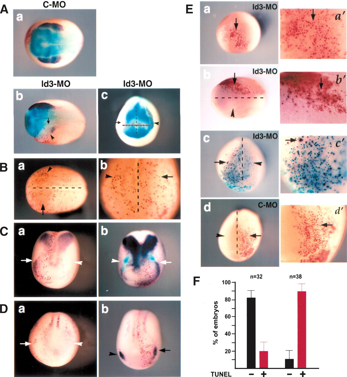 Id3 is required for cell proliferation and survival of neural crest. (A) Neurula-stage embryos injected with morpholino oligos and subjected to double in situ hybridization with FoxD3 and Sox2 RNA probes. (Panel a) Dorsal view of a control embryo (anterior toward left) shows foxD3 expression (purple) intact on the side injected with control-MO (Red-Gal). (Panels b,c) Dorsal view of an embryo (anterior toward left) injected with Id3-MO and anterior view of another embryo injected with Id3-MO show that the neural crest marker foxD3 (purple, arrowhead) is lost on the injected side (Red-Gal), while the neural plate (border line, arrow) marked by sox2 expression (light blue) is not expanded (red dotted line) and does not replace the neural crest. The black dotted line indicates the midline. (B) Cell proliferation assay measured by immunostaining with antiphosphorylated histone H3 antibody in an embryo injected with Id3-MO. Dorsal view (panel a) and magnified anterior view (panel b) of an embryo show that mitotic cells (black dots at control side, arrowhead) are absent or decreased in the neural crest region injected with Id3-MO (arrow, Red-Gal). (C) Expression of cell cycle inhibitor in the embryos injected with Id3-MO. (Panel a) p27XicI (purple, arrow) is ectopically expressed in neural crest progenitors when Id3 is depleted (white arrow). (Panel b) Double in situ hybridization reveals that foxD3 expression (light blue, arrowhead) in neural crest is replaced by p27XicI expression (purple, arrow) at the side injected with Id3-MO (Red-Gal). (D) Differentiation markers in the embryos injected with Id3-MO. n-tubulin (panel a) and NeuroD (panel b) are not ectopically expressed in the neural crest at the side injected with Id3-MO at stage 13. (Panel b) Their expression is slightly increased in trigeminal ganglia at the side injected with Id3-MO (arrow) at stage 14. (E) TUNEL staining in the embryos injected with Id3-MO or control-MO. (Panels a,aâ²) Id3-MO-injected region (Red-Gal) of a stage 11 embryo is negative (arrow, no black dot) in TUNEL staining. (Panels b,bâ²) Dorsal view of a stage 14 embryo (anterior toward left) shows significantly increased cell death (black dots, arrow) on the neural crest region injected with Id3-MO (Red-Gal), compared with the uninjected side (arrowhead). (Panels c,câ²) Anterior view of a stage 17 embryo also shows elevated cell death (black dots, arrow) on the neural crest region injected with Id3-MO (X-gal staining, turquoise color), compared with the uninjected side (arrowhead). (Panels d,dâ²) Anterior view of a stage 16 embryo injected with control-MO shows that cell death doesn't occur in the injected region (Red-Gal, arrow), compared with the uninjected side (arrowhead). The MO-injected region is magnified for each embryo in aâ²-dâ². (F) The graph illustrating the results of TUNEL staining as percentages of TUNEL-negative (black bar) or TUNEL-positive (red bar) embryos out of the embryos injected with control-MO or Id3-MO. |