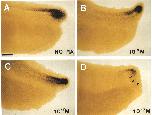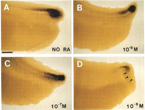 (A) untreated embryos cultured in 0.1 � Barth's medium, (B-D) embryos treated from stage 13 onwards with 10-8, 10-7 , 10-6M all-trans RA, respectively. Chordoneural hinge expression is decreased in (D). Arrowheads indicate the position of the malformed postanal gut. Bar, 200 um.