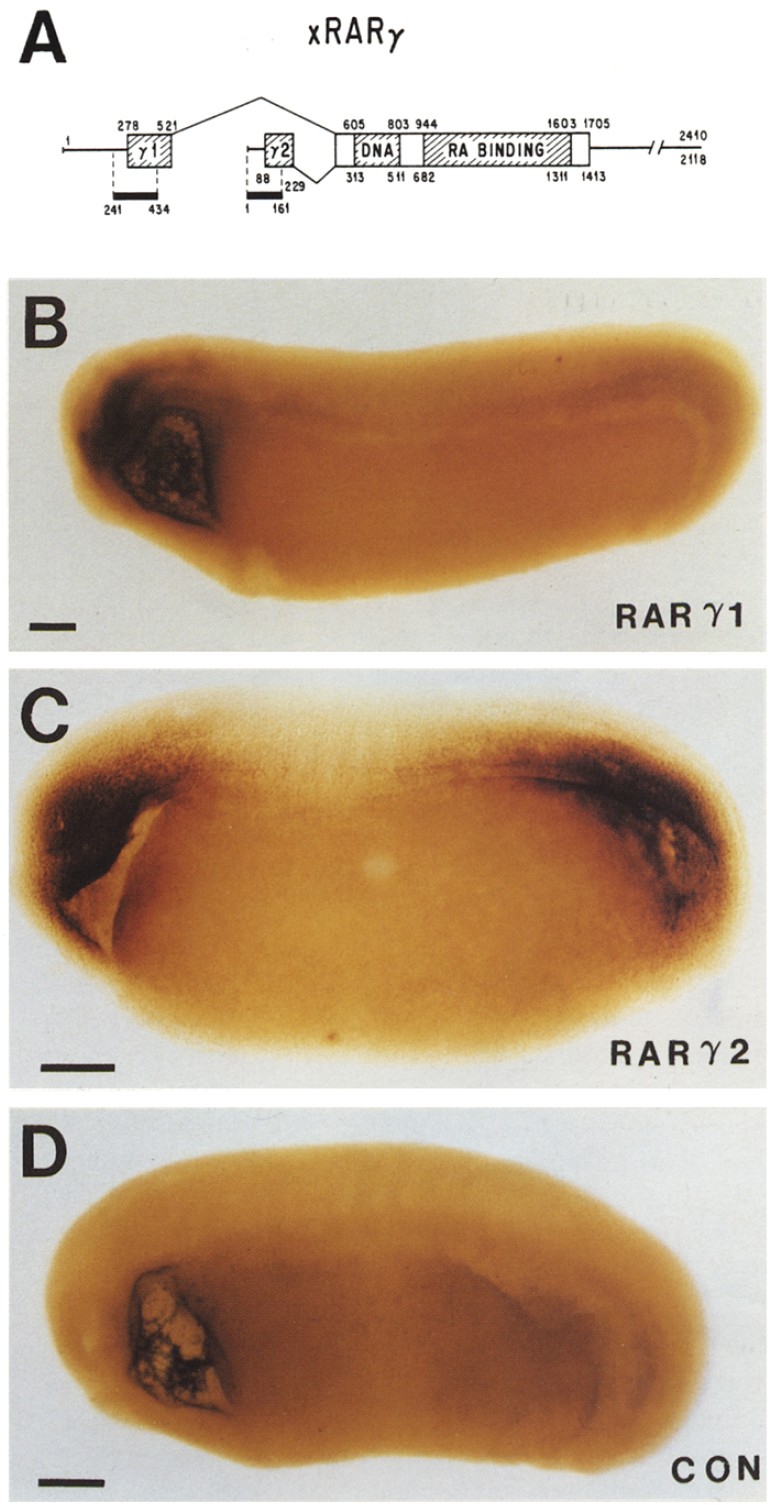 Fig. 2 (right). RAR gamma isoforms are differentially expressed. Specific probes were hybridized to late neurula/early tailbud embryos. (A) Diagram