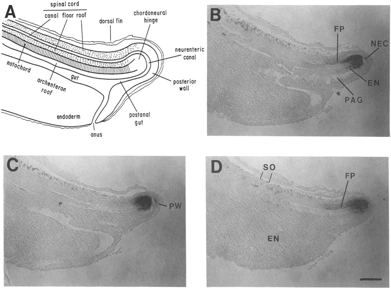derived from the examination of serial sections. EN, endoderm: FP, floor plate of the spinal cord: NEC, neurenteric canal: PAG, postanal gut;
