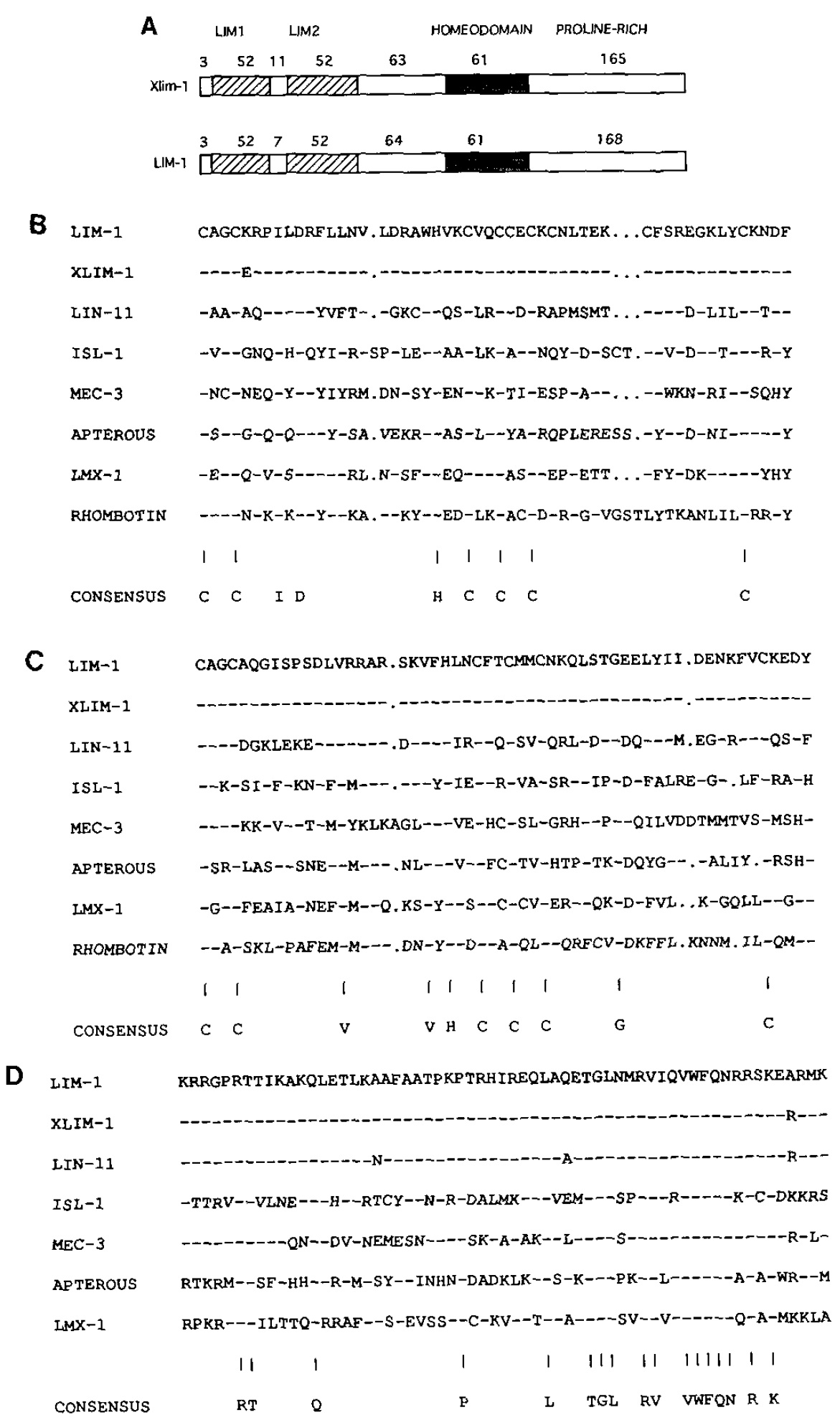 cDNAs encoded by the mouse homolog (Lim-1) of the Xenopus LIM-class homeobox gene Xlim-1 have been isolated from an 8.5-day mouse embryo cDNA library. Nucleotide and deduced amino acid sequences show a high degree of identity with Xlim-1 in the LIM and homeodomains, and 85% identity over the whole protein. An interspecific back-cross has been used to show close linkage of Lim-1 to the endogenous proviral marker Mpmv-4 on mouse chromosome 11. Whole mount in situ hybridization studies have been carried out on mouse embryos between 6.5 and 10.5 days. In mid- to late-streak stage embryos, Lim-1 is expressed in a restricted region of mesoderm in the primitive streak, with the highest level of signal at the anterior. At 7.5 days, transcripts can be seen in a horseshoe-shaped pattern in the periphery of the node, as well as along both sides of the immediately adjacent notochord. In addition, transcripts are present in presumptive lateral and intermediate mesoderm. Later, expression becomes progressively restricted to intermediate mesoderm, the nephrogenic cords, and eventually mesonephric ducts and tubules. By 10.5 days Lim-1 transcripts also appear in restricted regions of the central nervous system (CNS) that are associated with sensory function. The lateral diencephalon, hindbrain, and presumed commissural neurons in the dorsal spinal cord all show Lim-1 expression. In the adult, Lim-1 is expressed in the cerebellum/medulla and kidney, and at very low levels in the cerebrum. These data suggest that in the mouse embryo Lim-1 plays a role in early mesoderm formation and later specification of a differentiated phenotype in subsets of cells of the mesonephros and sensory neurons of the CNS.