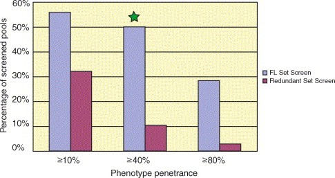 Fig. 1. Comparison of the phenotype penetrance between the redundant set and the unique full-length set screen. One hundred and six pools of a redundant neurula stage cDNA library (pool size 96 clones=10.176 cDNAs) and 120 pools of the unique full-length (FL) gastrula/neurula cDNA library (pool size eight clones=960 unique and full-length cDNAs) were screened by overexpressing â5 ng of in vitro transcribed RNA in one cell of two-cell stage embryos. Embryos were analysed at neurula and tadpole stages for changes in morphology and in the neural differentiation marker N-tubulin. Only phenotypes with a penetrance (percentage of affected embryos in a batch) of 40% or more were scored as ârealâ but analysis for lower penetrance is also shown. In the redundant set screen â10% (n=11) of the screened pools showed a phenotype (â¥40% penetrance) whereas this was raised to 50% (n=60) in the FL set screen (green star). At a higher penetrance (â¥80%) there is also a big difference in phenotype recovery between the redundant and FL set screen (3 vs. 28%). Thus the FL set screen was five-fold more sensitive in detecting gain-of-function phenotypes compared to an unmodified cDNA library.
