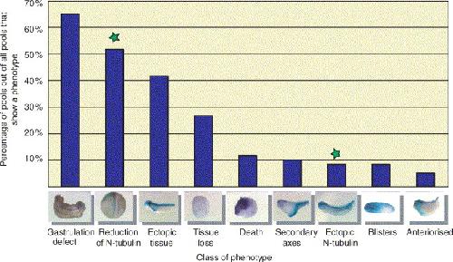 Fig. 2. Phenotypic categories found when screening the unique FL set pools. Sixty pools of the unique full-length gastrula/neurula stage cDNA library gave rise to an overexpression phenotype (at least 40% penetrance). Nine major categories (x-axis) of phenotypes, for which representative images are shown below each bar, were observed and scored. Phenotypes were classified as secondary axes (rather than ectopic tissue outgrowth) if the ectopic tissue shows axial organisation, like secondary heads (at tadpole stage) or complete secondary neural tubes (at neurula stage). Ectopic tissue outgrowth comprises tumour-like growths, protrusions (which lack clear axial structures) and other abnormal thickenings observed. Blisters are oedema-like appearances, which do not contain tissue. Phenotypes such as loss/shedding of cells and or limited cell death were grouped into tissue loss. In contrast, embryos that showed global death are classified in death. Since most of the phenotypes observed were complex, many of the pools were included in more than one category (thus the sum of the percentages is greater than 100%). Of particular interest were phenotypes that affected the neural differentiation marker N-tubulin (stars), since they might contain an activity involved in the neurogenesis pathway. (Purple staining in images: N-tubulin, light blue staining: lineage tracer LacZ).