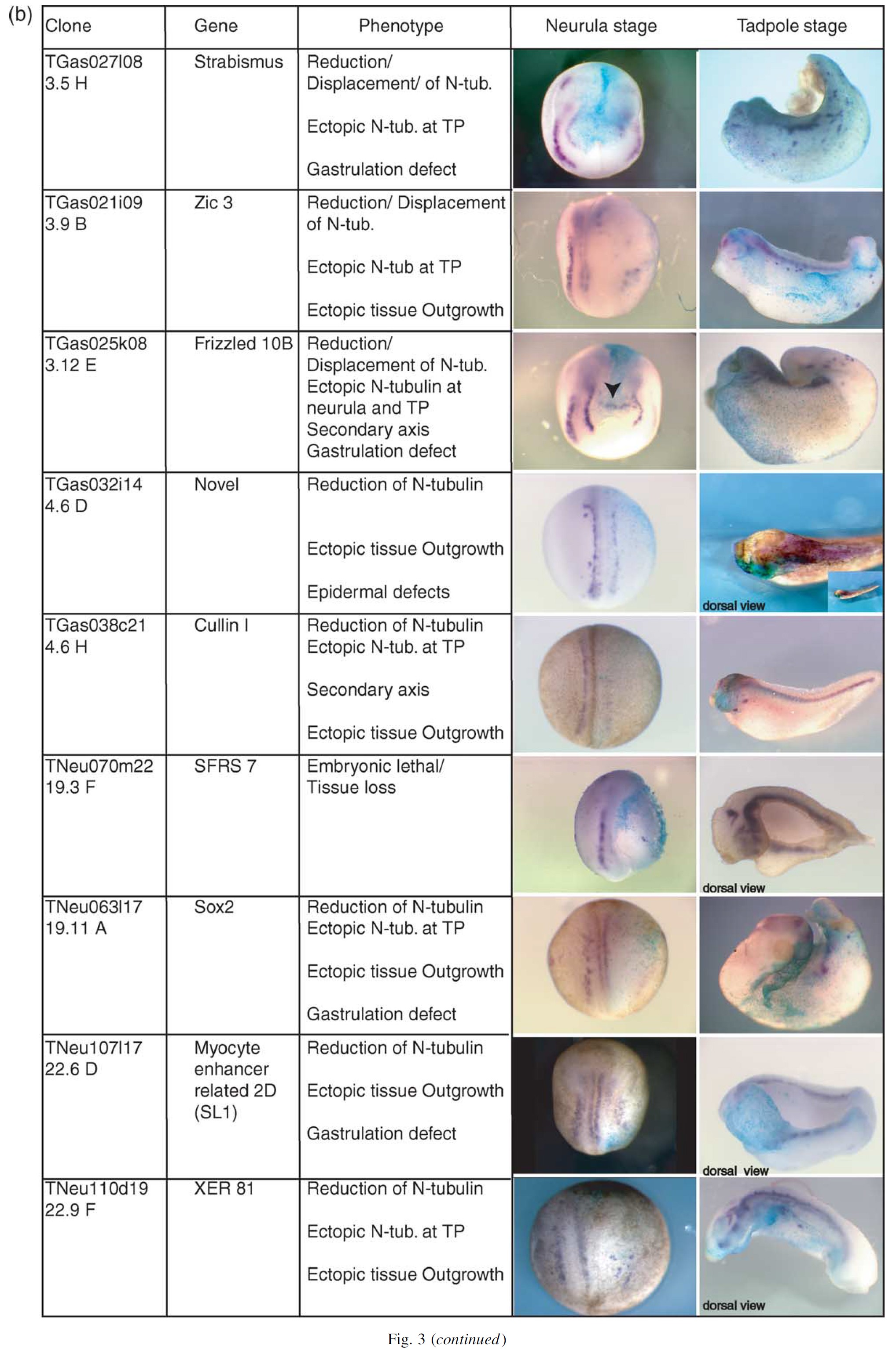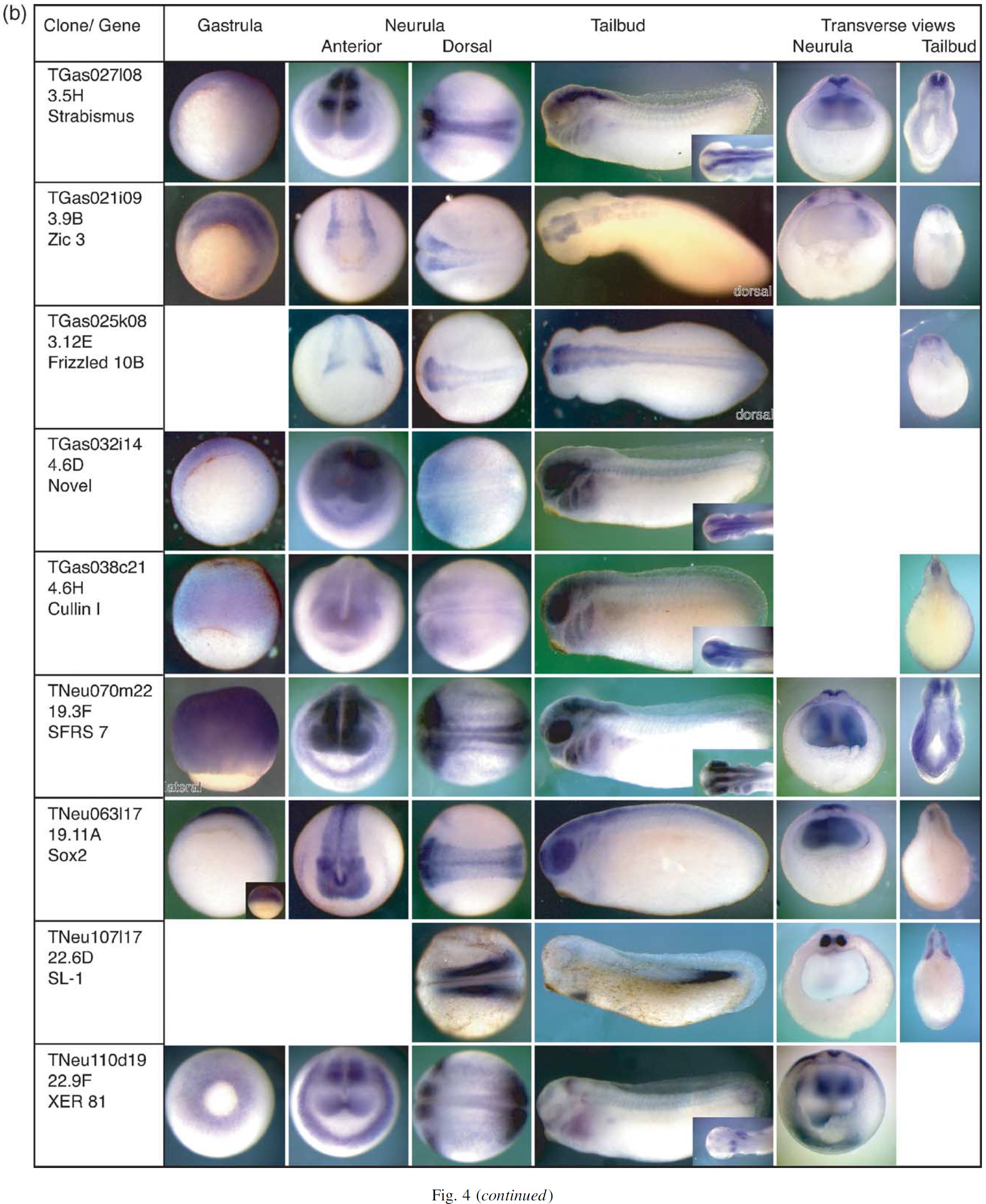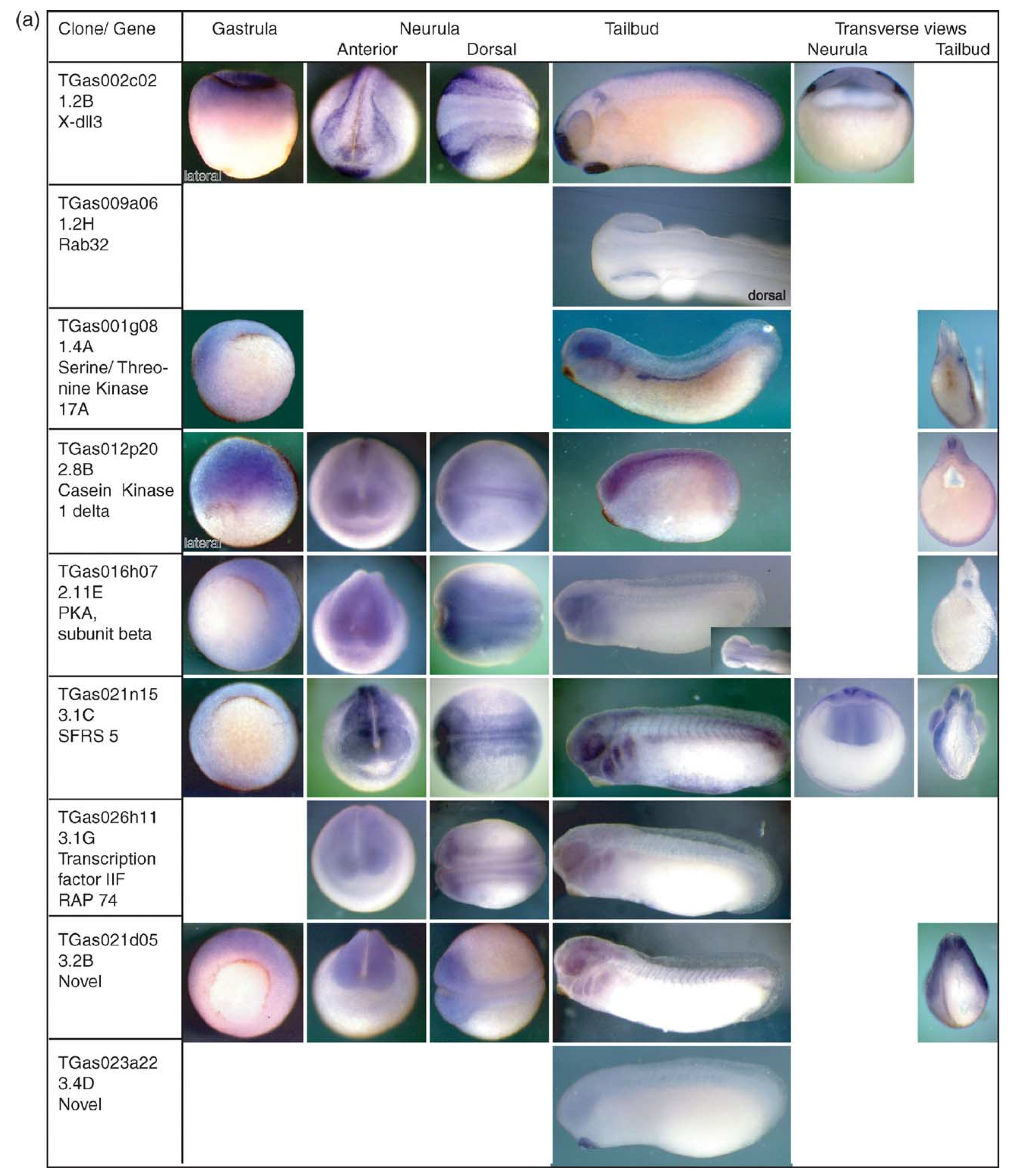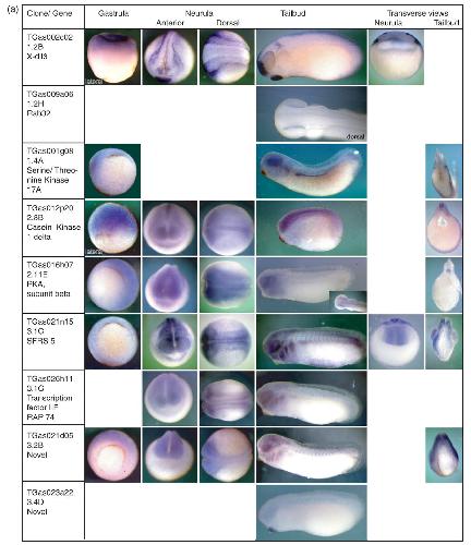 Fig. 4. (a,b) Expression patterns of the single clones identified in the unique full-length set screen. Xenopus tropicalis gastrula, neurula and tailbud stage