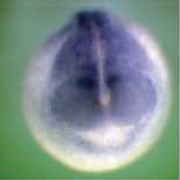 beta-galactosidase RNA as a lineage tracer (light blue staining) were injected animally into one cell of two cell stage Xenopus laevis embryo. Embryos were