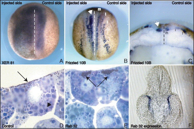 Fig. 5. Additional detail on the overexpression of 4 selected genes and Rab32 expression. (a) XER 81 RNA injections expand X-Sox3 (purple) on the injected side. (b+c) Frizzled10B RNA injections enhance the medial (motorneuron) stripe of N-tubulin expression (white arrowhead, in wholemount (B) and transverse (C) view), in addition to the ectopic expression of N-tubulin observed in the floorplate (shown in Fig. 4b). (dashed line-midline, l-lateral, i-intermediate, m-medial). (d+e) 1 μm sections of Rab32 (1 ng) injected (E) and control Xenopus laevis (D) embryos. (D) In wild type embryos the melanosomes (darkly pigmented vesicles, arrow) are localised predominantly under the apical surface, but some can be found deeper within the cells (arrowhead). In contrast, when Rab32 was overexpressed the melanosomes were clustered tightly together and localised under the apical surface (arrows). (f) Transverse section (30 μm) of a bleached Xenopus tropicalis tailbud embryo in situ hybridised with an antisense probe to Rab32. Rab 32 is expressed in the retinal pigment epithelium (purple).