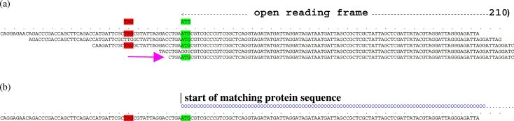 Fig. 6. Creation of a unique full-length set. (a) The determination of the full-length representative in an EST cluster. 5â² sequenced ESTs from the X. tropicalis neurula and gastrula stage cDNA libraries that are 99% similar over a length of 100 nucleotides were aligned and clustered. Open reading frames of at least 210 base pair were identified. In order to ascertain that clusters contain full length EST clones in at least 2 and at least 50% of the EST clones at the same position a start codon (green) must be preceded by an in frame stop codon (red). To avoid 5â² UTR dependent negative translational control an EST with the shortest 5â²UTR (arrow) was chosen as a full-length representative of the cluster/gene and re-arrayed into the unique and full-length set. (b) Criteria for selecting singletons as full-length. EST clones that did not align with any other clones were classified as singletons. Only singletons that contained a long ORF with a start codon preceded by a stop codon were considered for the full-length set. However, since the 50% rule (see above) cannot be applied in this case, Blast information was also used to determine if a singleton is full length. Only if the translational start of a matching protein in the database matched the start codon of the singleton, the latter was included in the full-length set.