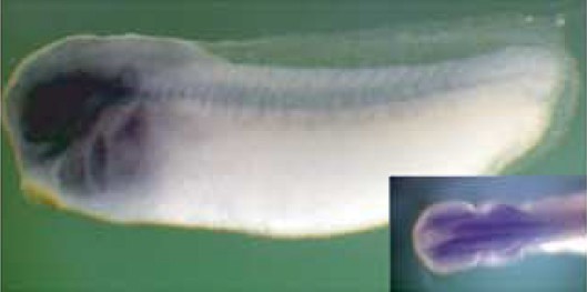 stage embryos are viewed dorsally with anterior to the top and tadpoles are viewed laterally with anterior to the left. A transverse section is shown for clone