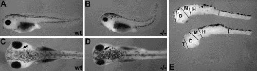 Fig. 4. Puffy Eye. (A and C) Side and top views of stage-matched wild-type controls, respectively. (B and D) Puffy Eye mutant embryos displaying the