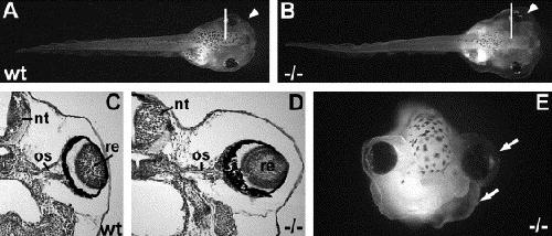 Fig. 8. Balloon Head. (A and C) Top view and cross-section through the head of a wild-type tadpole. (B and D) Similar views of a mutant Balloon Headtadpole. The arrowheads in (A) and (B) indicate regions affected in the mutant. The white line in (A) and (B) demarcate the plane of section seen in (C) and (D). (E) Arrows point to areas of edema around the eye and jaw of a Balloon Headtadpole. nt, neural tube; os, optic stalk; re, retina.
