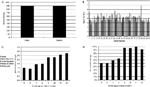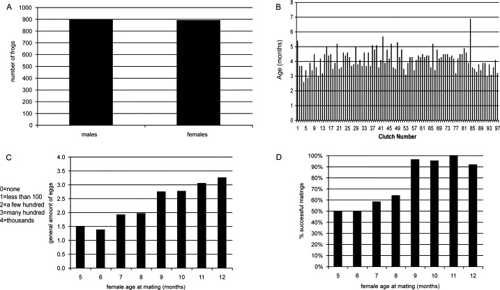 Fig. 1. Sexual maturation. Panel A shows the total numbers of males and females from 95 clutches that were monitored for sex development. Panel B shows the age when male nuptial pads were first seen in 97 independent clutches. Panel C shows the average rating of egg quantity generated in females from 5 to 12 months of age. Panel D shows the percentage of successful matings for females from 5 to 12 months of age.