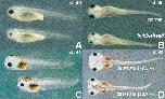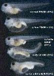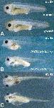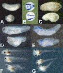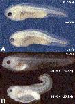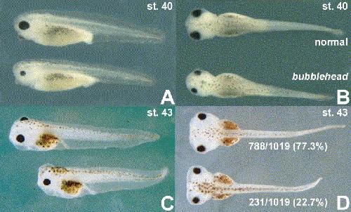 Fig. 5. bubblehead mutation. All panels show normal (top) and bubblehead phenotype (lower) sibling embryos. In all panels, anterior is to the left. Panels A and B show lateral and dorsal views of stage 40 embryos, respectively. Panels C and D show lateral and dorsal views of stage 43 embryos, respectively. Panel D is labeled with numbers from a representative mating of bubblehead heterozygous parents.