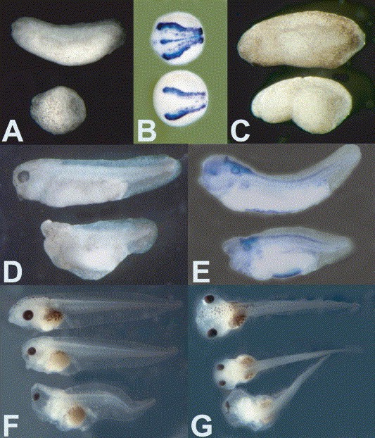 Fig. 2. Immature eggs produce stereotyped hyperventral and anterior defects. All panels show normal (top) and defective (lower) sibling embryos. Panel A shows hyperventralization phenotype at stage 27. Panels B show stereotyped midline and anterior defects. A combined in situ hybridization for shh (midline), olig2 (intermediate staining), and slug (neural plate border) reveals defective dorsal midline development of stage 15 sibling embryos (Panel B). Panels C and D show anterior defects at stage 24 and 37/38 embryos, respectively. Panel E shows stage 37/38 embryos stained for pax2 (neural, otic vesicle, kidney) and globin (ventral blood islands). Panels F and G show stage 41 embryos. In all panels, anterior is to the left. Dorsal views are shown in Panels B and G, all other panels are lateral views.