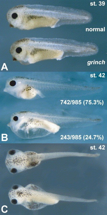 Fig. 3. grinch mutation. All panels show normal (top) and grinch phenotype