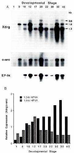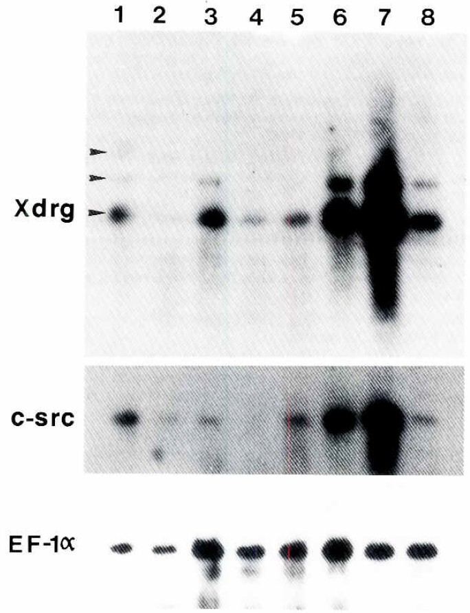 Fig. 3. Expression of Xdrg mRNA in Xenopus embryos_ (A) Northern blot analysis. Each lane contained 2-5 pg of poly A+ selected RNA Isolated from the total embryos ar the indicated stage of development. The same blot was sequentially hybridized to Xdrg. c-src and EF-1a probes. The positions and sizes of the three transcripts hybridizing to theXdrg probe are indicated by arrowheads. The signals shown here were obtained after approximately 48 h (Xdrg). 24 h (c-src) and 3 h (EF-la) exposures to the Xray films. Longer exposures (not shown here) reveal the presence of Xdrg and c-src hybridizing bands in stage 1and EF-7a band in stage 8 fanes also.