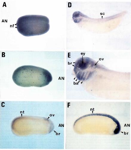 (ov) and the neural tube (ntJ. Note the strong signals In the anterior and posterior regions of the CNS. (D,E) A stage 32 embryo showing expression In