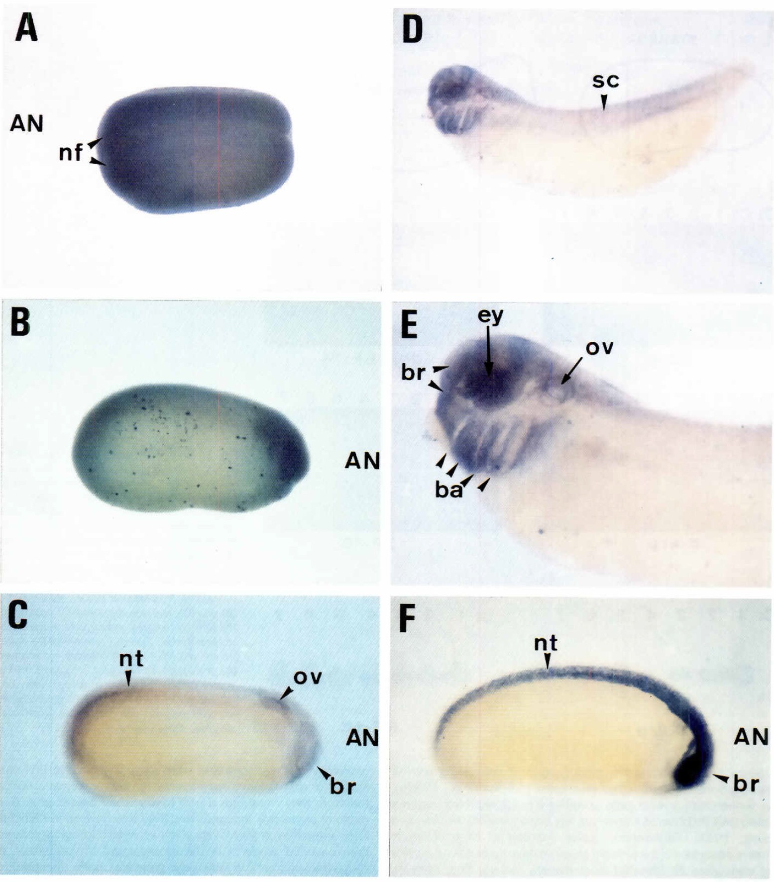 of the stage 17 (neurula) embryos showing expression in neural folds (nf). IC) A stage 22 embryo showing expression in developing brain (br), otic vesicle