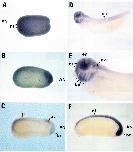 Fig. 4. Whole-mount in situ hybridization analysis of XdrgmRNA distribution in Xenopus embryos. Embryos in A through E were hybridized with