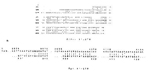 (Ben-David et al., 1991) and human (Watson et al., 1992) cDNAs: conserved nucleotides are in bold type. (B) Homology between the 3'-UTR
