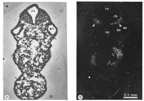 Fig. 9. In situ hybridization to a stage 32 embryo transverse section (dorsal on top). (A) Transverse-section of a stage 32 embryo, at the level of