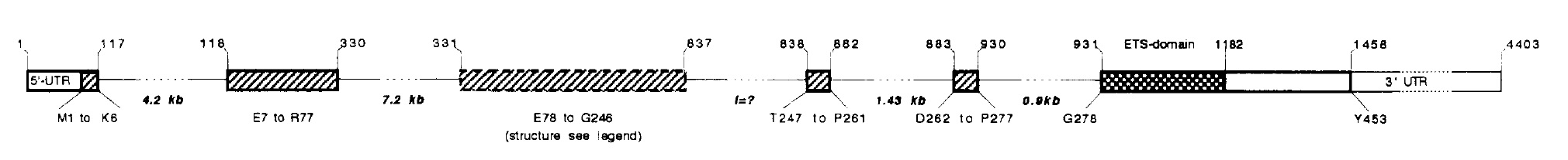 or only partial information is available. The coding sequence is hatched and the ETS-domain is doubly hatched. The numbers at the corners of boxes refer to the nucleotidc positions in the
