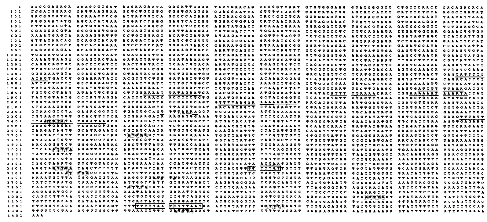 nuclear polyadenylation signals are in bold type. The putative cytoplasmic polyadenylation elements are boxed. The ATTTA mRNA
