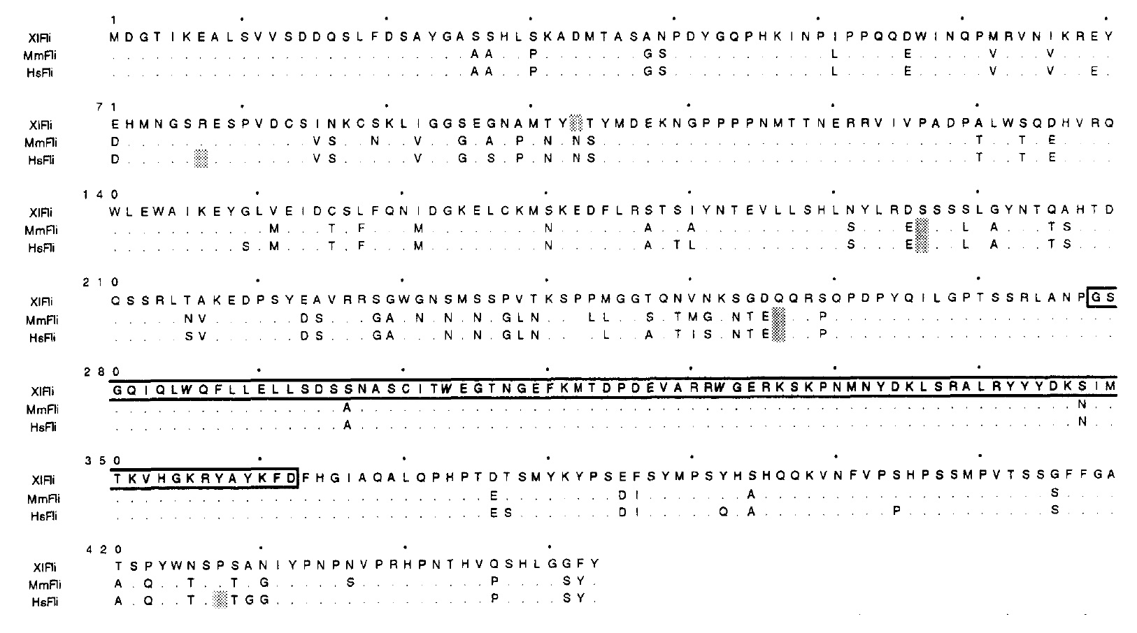 Fig. 4. Comparison of the amino acid sequences of the Xenopus, mouse (Ben-David et al., 1991) and human (Watson et al., 1992) Fli proteins.