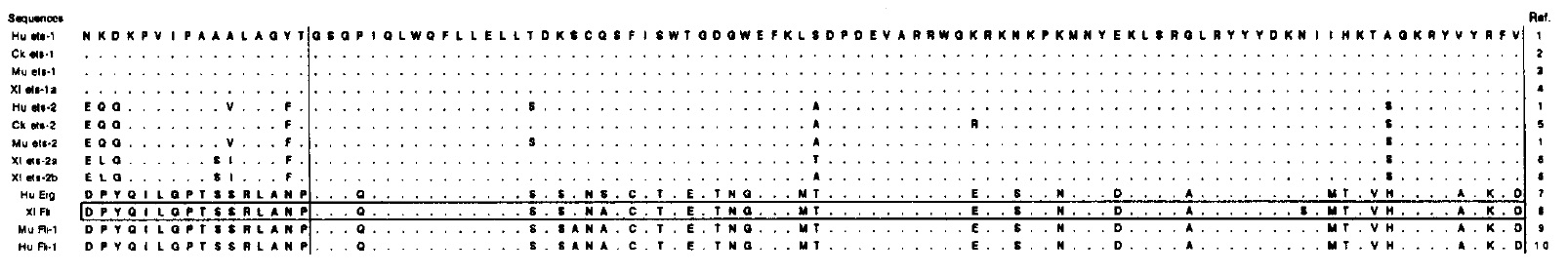Fig. 5. Comparison of the peptide sequences in the vicinity of the ETS-domain, for the ets-1, ets-2, erg and fli genes. The ETS-domain is limited