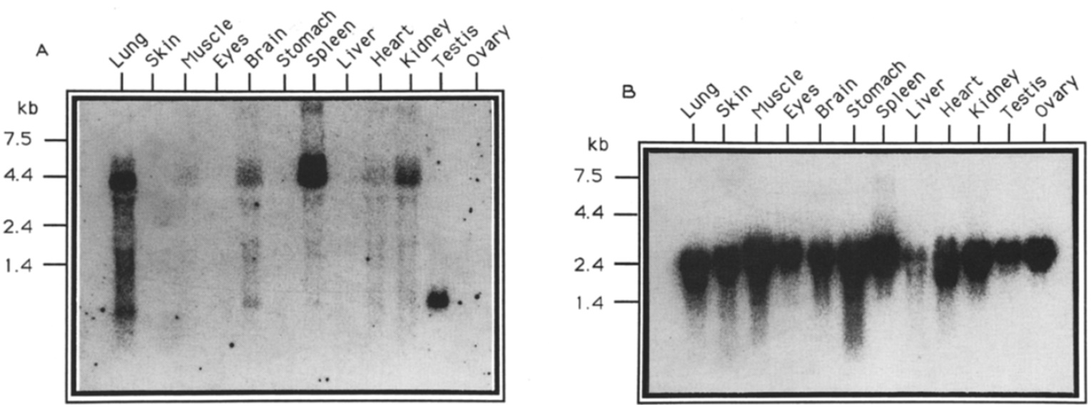 Fig. 10. Northern blot analysis of Xl-fli expression in adult organs. (A) Autoradiography of the nitrocellulose membrane; figures at the left side of