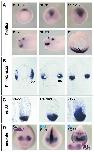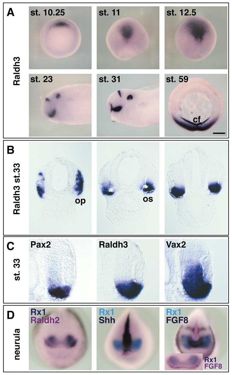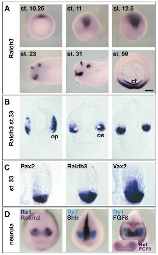 Fig. 4. Expression pattern of Raldh3 during Xenopus development. (A) Raldh3 expression as detected by whole-mount in situ hybridization of whole embryos (stage 10.25-31) or dissected neural retinas, without lens and pigmented epithelium (stage 59). cf, choroid fissure. Scale bar: 350 μm. (B) Raldh3 expression in transverse sections of stage 33 embryos after whole-mount in situ hybridization. From left to right, sections show expression at progressively posterior levels. op, olfactory placode; os, optic stalk. (C) Comparison of Pax2, Raldh3 and Vax2 expression in the optic cup in transversal sections of stage 33 embryos after whole-mount in situ hybridization. (D) Double in situ hybridizations of Rx1 with Raldh2, Shh or FGF8 on mid- to late neurula embryos shown from anterior view. The inset shows a double in situ hybridization of Rx1 with FGF8 on an early neurula embryo.