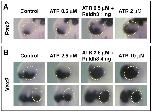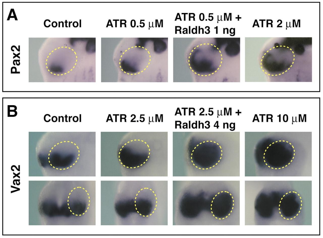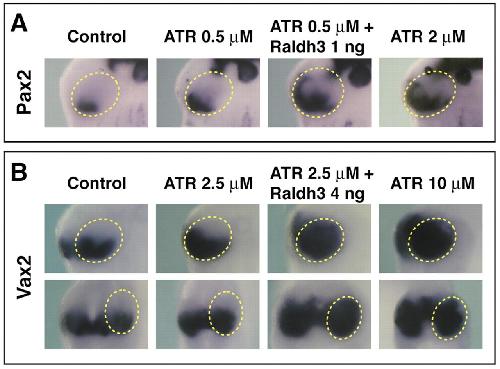 Fig. 5. Raldh3 overexpression in the presence of ATR reproduces the effects of RA treatments on eye DV polarity. (A) Embryos were bilaterally injected with a total of 1 ng Raldh3 mRNA and treated with 0.5 μM ATR from stage 12.5/13, followed by molecular marker analysis at stage 33. The combination of Raldh3 and ATR expands Pax2 expression, while ATR alone has only a weak effect. A comparable expansion of Pax2 is obtained by a dose of 2 μM ATR in the absence of exogenous Raldh3. (B) The combination of 4 ng Raldh3 mRNA and 2.5 μM ATR can upregulate Vax2 in the DR, while ATR alone has only a weak effect. Strong Vax2 upregulation is also caused by a dose of 10 μM ATR in the absence of exogenous Raldh3, as shown in both lateral (upper row) and anterior view (lower row).