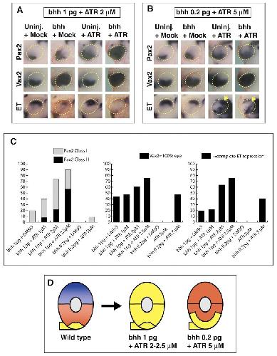 Fig. 7. RA and Hh signaling can collaborate in eye ventralization. (A) Embryos were unilaterally injected with 1 pg bhh mRNA and treated with 2 μM ATR from stage 12.5/13. Pax2 is strongly upregulated in the eye by the combination of bhh and ATR, but weakly by bhh or ATR alone in stage 33 Xenopus embryos. Vax2 expression can be activated in the DR by these doses of bhh in the absence of ATR. ET is reduced by bhh or ATR alone, but is strongly repressed by the combination of bhh and ATR. (B) Embryos were unilaterally injected with 0.2 pg bhh mRNA and treated with 5 μM ATR from stage 12.5/13. Vax2 is upregulated in the DR by the combination of bhh and ATR, but not by bhh or ATR alone. These doses of bhh and ATR weakly activate Pax2 expression. ET expression in the DR is partially reduced by bhh or ATR alone, but is strongly repressed by the combination of bhh and ATR. The yellow arrow indicates ET expression domain in the DR. (C) Quantification of the effects of bhh and ATR on Pax2, Vax2 and ET expression. Between 21 and 25 embryos were analyzed for each sample in these experiments. (D) Schematic representation of the results shown in A and B. The combination of 1 pg bhh mRNA with 2-2.5 μM ATR strongly expands the OS. The combination of 0.2 pg bhh with 5 μM ATR ventralizes the DR.