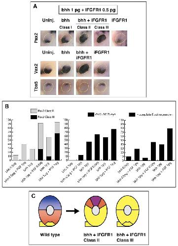 Fig. 8. FGFR and Hh signaling can collaborate in eye ventralization. (A) Embryos were unilaterally co-injected with 1 pg bhh mRNA and 0.5 pg iFGFR1 mRNA, and induced with AP20187 from stage 12.5/13, followed by molecular marker analysis at stage 33. Pax2 is mainly activated within the ventral half of the eye (class I eyes) by bhh alone, while in the presence of iFGFR1 and bhh Pax2 expression extends into the dorsal eye (class II and class III eyes). Co-injection of bhh and iFGFR1 mRNAs also slightly increases the frequency of eyes with ubiquitous Vax2 expression and more strongly represses Tbx5 when compared with bhh alone. Under these conditions, iFGFR1 mRNA alone has no obvious effect on Pax2, Vax2 and Tbx5 expression. (B) Quantification of the effects of bhh and iFGFR1 on Pax2, Vax2 and Tbx5 expression. Between 24 and 30 embryos were analyzed for each sample in these experiments. (C) Schematic representation of the results shown in A. In class II eyes, the expanded OS does not reach the most dorsal retina, which can acquire in part ventral identity. In class III eyes, the retina is mostly or completely transformed into OS.