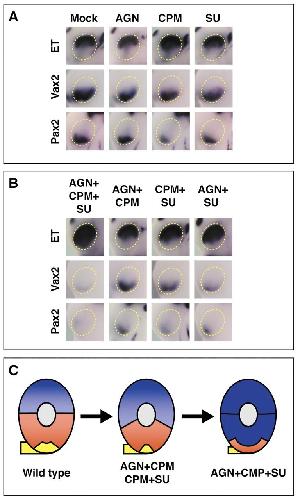 Fig. 10. Loss-of-function effects of RA, Hh and FGFR signaling pathways on eye DV polarity. Embryos were treated from stage 10.5 with 10 μM AGN194310 (AGN), 100 μM cyclopamine (CPM) and 25 μM SU5402 (SU) in different combinations, and analyzed for molecular marker expression at stage 30/31. (A) Effects of the single inhibition of any of the RA, Hh and FGFR signaling pathways, when compared with mock-treated embryos. (B) Effects of double and triple inhibition of RA, Hh and FGFR pathways. (C) Schematic representation of the results shown in A and B. Strong eye dorsalization is caused by triple inhibition of RA, Hh and FGFR signaling, while double inhibitions produce weaker effects.