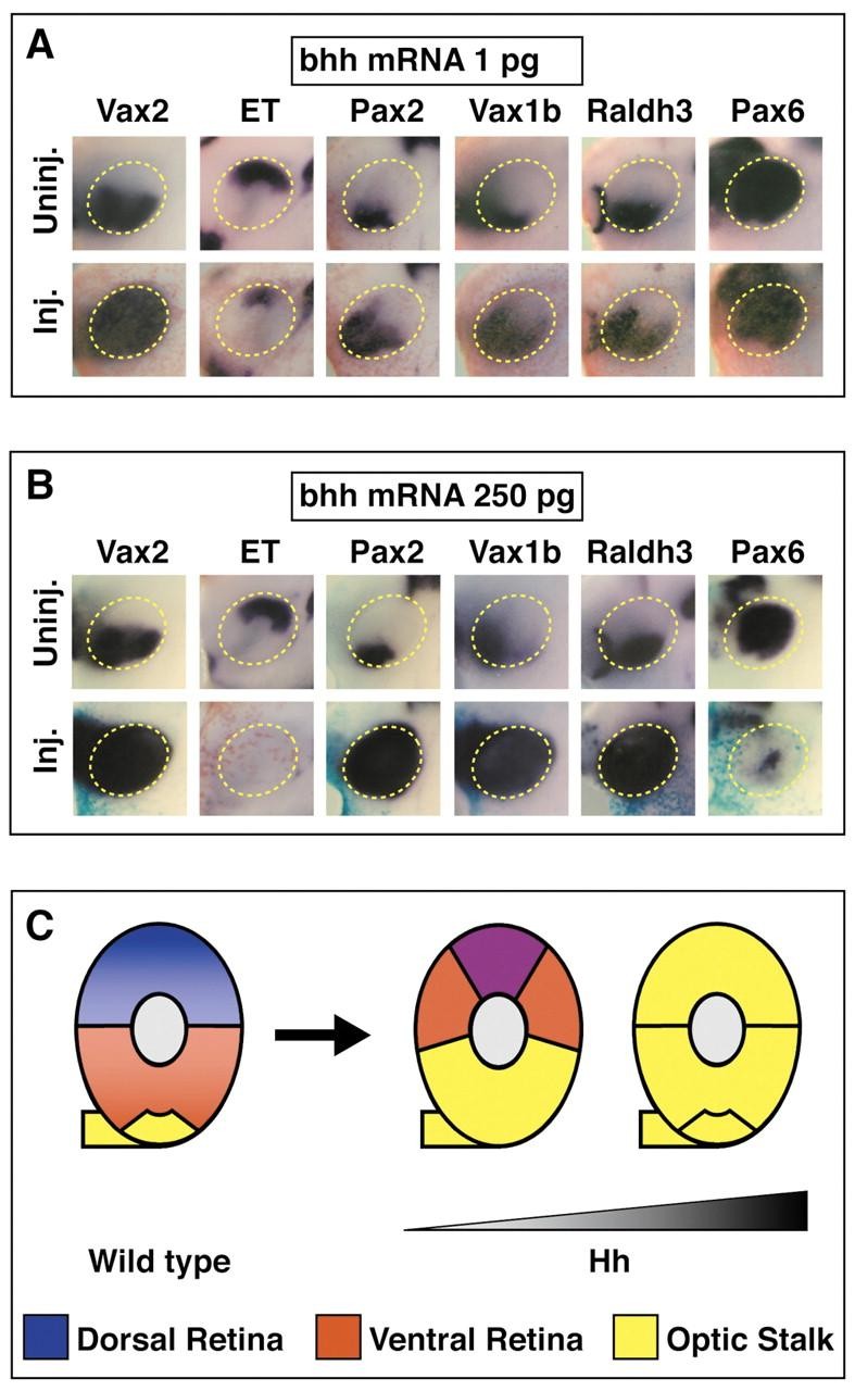 Fig. 1. Effects of Hh signaling overexpression on eye DV polarity. (A,B) The red or light-blue β-gal staining identifies the injected side. The broken yellow circles highlight the eye region. (A) Unilateral injection of low doses of bhh mRNA (1 pg) upregulates Vax2 in the DR and reduces ET in stage 33 Xenopus embryos. Pax2, Vax1b and Raldh3 are partially upregulated, but not in the DR, and the Pax6 domain is slightly reduced in these embryos. On the uninjected side, Vax2 is normally expressed in the OS and the VR; ET is expressed in the DR; Pax2, Vax1b and Raldh3 are expressed in the OS region and Pax6 is expressed in the retina region. (B) High doses of bhh mRNA (250 pg) upregulate Vax2, Pax2, Vax1b and Raldh3 throughout the eye, and repress ET and Pax6 expression. (C) Schematic representation of the results shown in A and B. Low Hh levels partially expand the OS and ventralize in part the DR. Purple indicates the overlap of ventral and dorsal character in the most dorsal retina. High Hh levels transform the entire retina into OS.