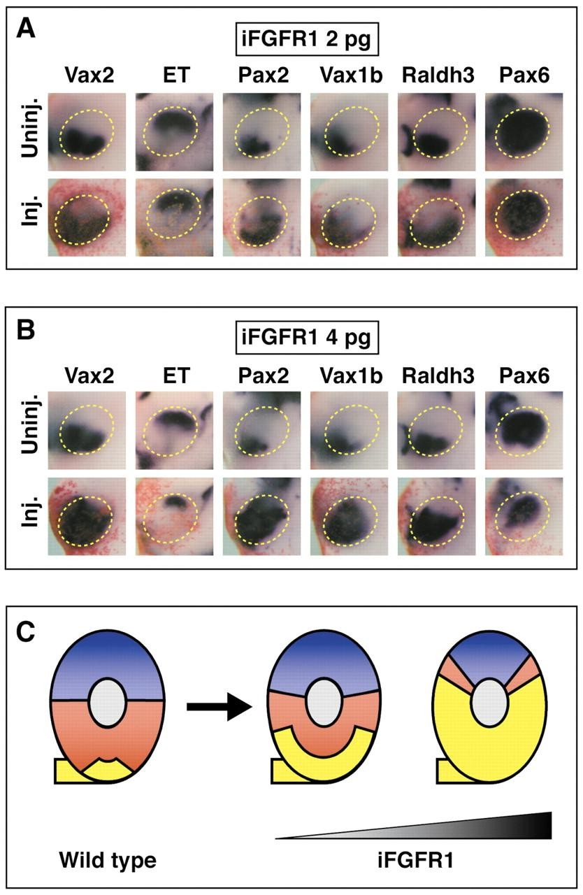 Fig. 3. Effects of FGFR signaling overexpression on eye DV polarity. (A) Unilateral injection of 2 pg iFGFR1 mRNA, followed by induction with AP20187 at stage 12.5/13, partially expands the expression domains of Vax2, Pax2, Vax1b and Raldh3 in the ventral eye, and weakly represses ET and Pax6 in stage 33 Xenopus embryos. (B) Injection of 4 pg iFGFR1 mRNA upregulates Vax2, Pax2, Vax1b and Raldh3 in the dorsal eye and strongly repress ET and Pax6. (C) Schematic representation of the results shown in A and B. Increasing FGFR levels progressively expands the OS at the expense of the retina.