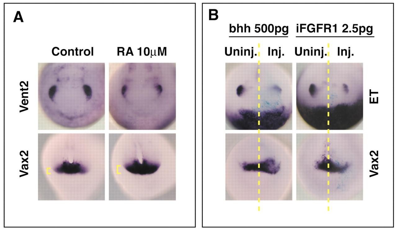 Fig. 6. RA, Hh and FGFR signaling pathways can partially ventralize the eye field at neurula stages. (A) In embryos treated with 10 μM RA from stage 12.5/13 (right column), the lateral region of Vax2 domain (indicated by the yellow brackets) is expanded at late neurula stages with respect to control embryos, while Vent2 domain is reduced. (B) Mid-late neurula embryos unilaterally injected either with 500 pg bhh mRNA or with 2.5 pg iFGFR1 mRNA, followed by induction with AP20187 from stage 12.5/13. Compared with the uninjected side, Vax2 expression is expanded, while ET is repressed. The broken yellow lines indicate the embryo midline.