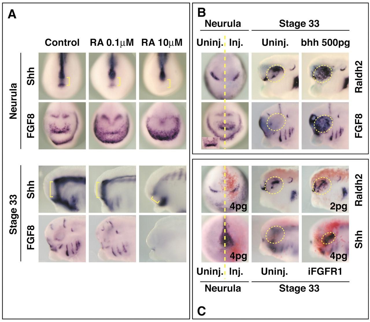 Fig. 9. RA, Hh and FGFR signaling pathways can crossregulate each other at the transcriptional level. (A) High dose RA treatments (10 μM) strongly repress Shh expression in the anterior midline (indicated by the yellow bracket) both at neurula and stage 33. The same RA doses cause fusion of the two stripes of FGF8 expression in the ANR and the anteroventral ectoderm in neurula stage embryos, while at stage 33 FGF8 expression is strongly downregulated in the whole head region. Low dose RA treatments (0.1 μM) have weaker effects on both Shh and FGF8. (B) Unilateral injection of 500 pg bhh mRNA laterally expands FGF8 expression in the anterior neural ridge but does not affect Raldh2 expression at neurula stages. The inset shows FGF8 expression in the ANR of an uninjected embryo at the same stage. The same dose of bhh upregulates both FGF8 and Raldh2 in the eye region at stage 33. (C) Unilateral injection of 4 pg iFGFR1 mRNA, followed by induction with AP20187 at stage 12.5/13, expands Shh expression in the prospective hypothalamic region at neurula, and activates Shh in the eye regions at stage 33. At doses of 4 and 2 pg, iFGFR-1 mRNA has no significant effect on Raldh2 expression at neurula stages and stage 33, respectively.