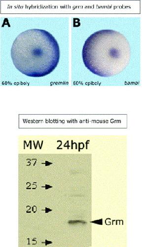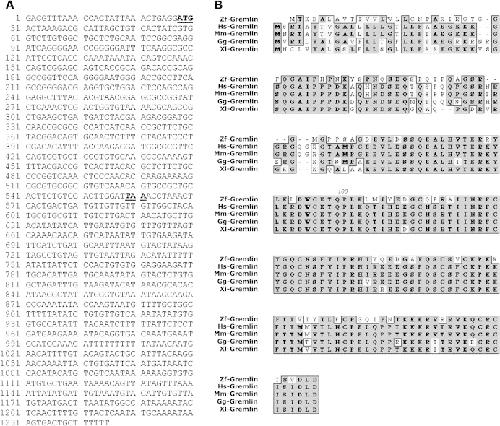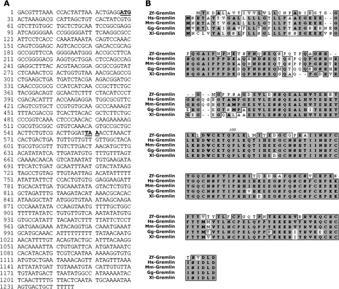 Fig. 1. Zebrafish gremlin (grm) nucleotide sequence and protein sequence comparison. (A) Full-length sequence of grm, and 5′ and 3′ UTR regions. Start and stop codons are underlined and bold. (B) Amino acidic sequence alignment of the Gremlin proteins, from zebrafish (Zf), human (Hs), mouse (Mm), chicken (Gg), and X. laevis (Xl). Residues from 96 to 170 constitute the Can domain (70–75% identity). Dark gray background indicates identical residues, light gray conservative substitutions, and white non-conservative substitutions.