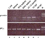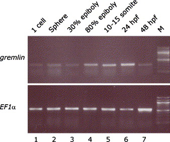 Fig. 2. grm expression during zebrafish development, shown by RT-PCR performed on RNA extracted from harvested embryos, from 1-cell to 48 hpf stages (lanes 1–7). Elongation factor 1α (EF1α) serves as a loading control.