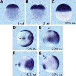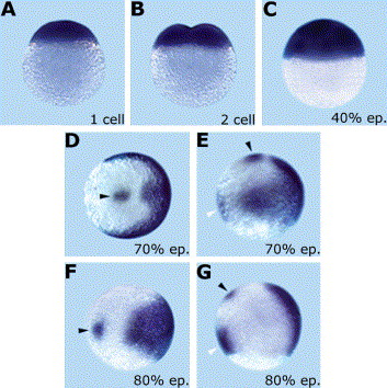 Fig. 3. grm maternal and zygotic expression during early stages of development and gastrulation. Expression pattern of grm as shown by whole-mount in situ hybridization at 1-cell (A), 2-cell (B), 40% epiboly (C), 70% epiboly (D,E), and 80% epiboly (F,G) stages. Black arrow heads point to the grm expression spot on the animal hemisphere (D–G), and white arrow heads in (E,G) indicate grm expression in the ventral mesoderm. (A–C,E,G) are lateral views, (D,F) animal views. Embryos are oriented with dorsal to the right and ventral to the left (D–G).