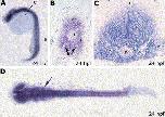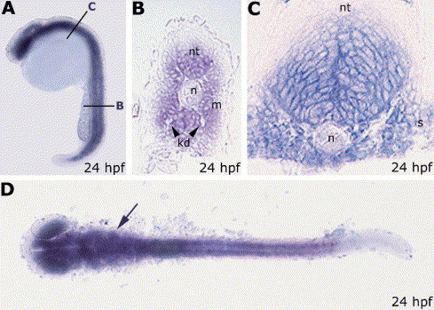 Fig. 5. Expression domain of grm at 24 hpf. Shown is a whole-mounted (A) and a flat-mounted (D) embryo, and trunk transverse sections (B,C). The arrow heads in (B) indicate the developing kidney ducts, and the arrow in (D) points to grm expression in the pectoral fin bud. Black lines in (A) indicate the cut position in the correspondent transverse sections (B,C). Embryos are oriented with anterior to the top (A) and to the left (D). (A) is a lateral and (D) a dorsal view. Abbreviations: kd, kidney ducts; m, myotome; n, notochord; nt, neural tube; s, somites.