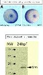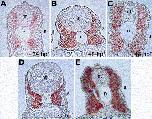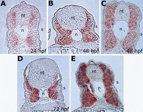 Fig. 6. Zebrafish Grm localization pattern at late stages of development. Localization of Grm protein in the developing somites as shown by immunodetection, on transverse trunk sections at 24 hph (A), 48 hpf (B,C), and 72 hpf (D,E) stages. (D) is the anterior-most section at the hindbrain level, (B) is a section of the anterior spinal cord, and (A,C,E) are posterior trunk sections. Abbreviations: n, notochord; nt, neural tube; s, somites.