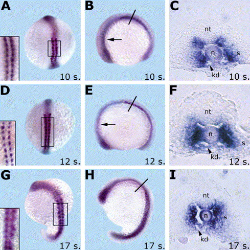 Fig. 4. grm expression pattern during somitogenesis. grm mRNA is detected at 10-somite (A–C), 12-somite (D–F), and 17-somite (G–I) stages, in whole-mounted embryos (A,B,D,E,G,H), and trunk transverse sections (C,F,I). Squares in (A,D,G) are high magnifications of the developing somites (dorsal view), arrows in (B,E) indicate grm expression in the anterior mesoderm, and arrow heads point to the forming longitudinal kidney ducts (C,F,I). Black lines in (B,E,H) indicate the cut position in the correspondent transverse sections (C,F,I). (A,D,G) are dorsal views, anterior to the top, and (B,E,H) are lateral views, anterior to the left. Abbreviations: kd, kidney ducts; n, notochord; nt, neural tube; s, somites.