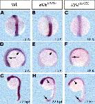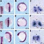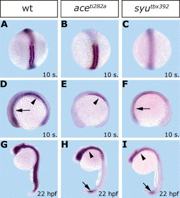 Fig. 7. Expression pattern of grm in WT, fgf8 and shh mutant embryos during somitogenesis and at 22 hpf. Shown are wild-type (A,D,G), aceti282a (B,E,H), and syutbx392 (C, F, I) embryos, stained with a grm probe. Arrows in (D,F) point to grm expression in the anterior mesoderm, and arrow heads in (D,E) to the nascent somites. In (H,I), the arrow heads indicate grm staining in the anterior mesoderm and ventral neural tube, and the arrows point to the restricted grm signal in the posterior region of the mutant embryos. Embryos are oriented with anterior to the top (A–C,G–I), or to the left (D–F). (A–C) are dorsal views, (D–I) lateral views.
