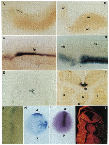 is restricted to the floor plate (fp) at the ventral midline. In F, F-spondin RNA is detected in the hypochord (h), an embryonic endodermal structure