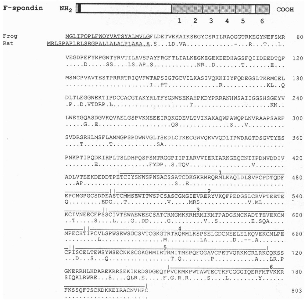 thrombospondin type I repeats (TSRs). (Lower) Amino acid alignment of the frog and rat F-spondin