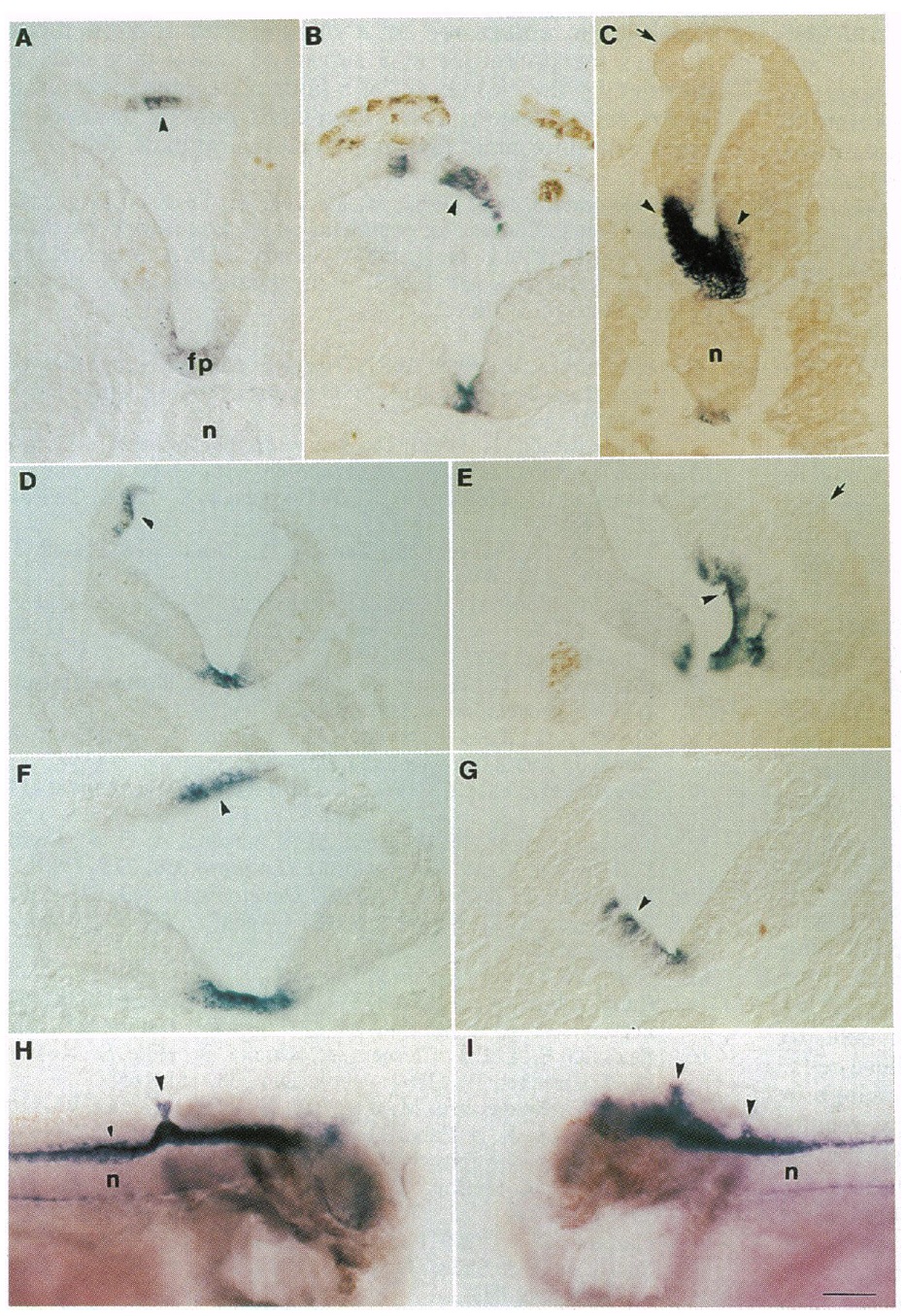 whole-mount, showing F-spondin RNA in the floor plate (fp) of the hindbrain and in the hypochord (h), located under the notochord (n). There