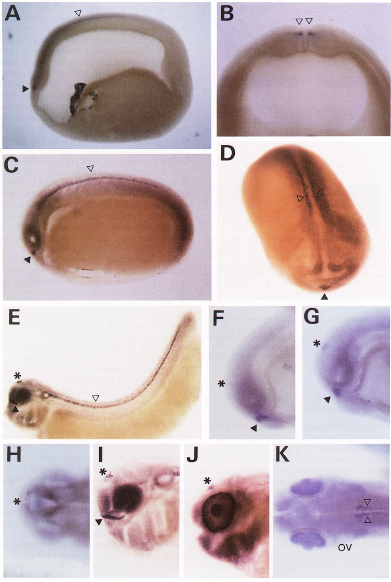 (I) stage 33/34, (J) stage 37/38, (K) stage 37/38 (dorsal view). Open triangle, hybridization to spinal cord and hindbrain solid triangle, anterior